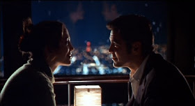 Karen is in Detroit in the hopes of tracking down Jack Foley (Clooney), the charismatic bank robber with whom she was entangled earlier. He’s got a thing for her and doesn’t hide it, actively pursuing her – well, in so much as a bank robber on the lam can actively pursue a federal marshal. She’s got a thing for him and does hide it, as best she can, which is pretty darn good, though not quite good enough. And there she is with her bourbon staring out the window at the snow falling on the Motor City. And then there he is in the reflection of the window wondering if he can buy her a drink.